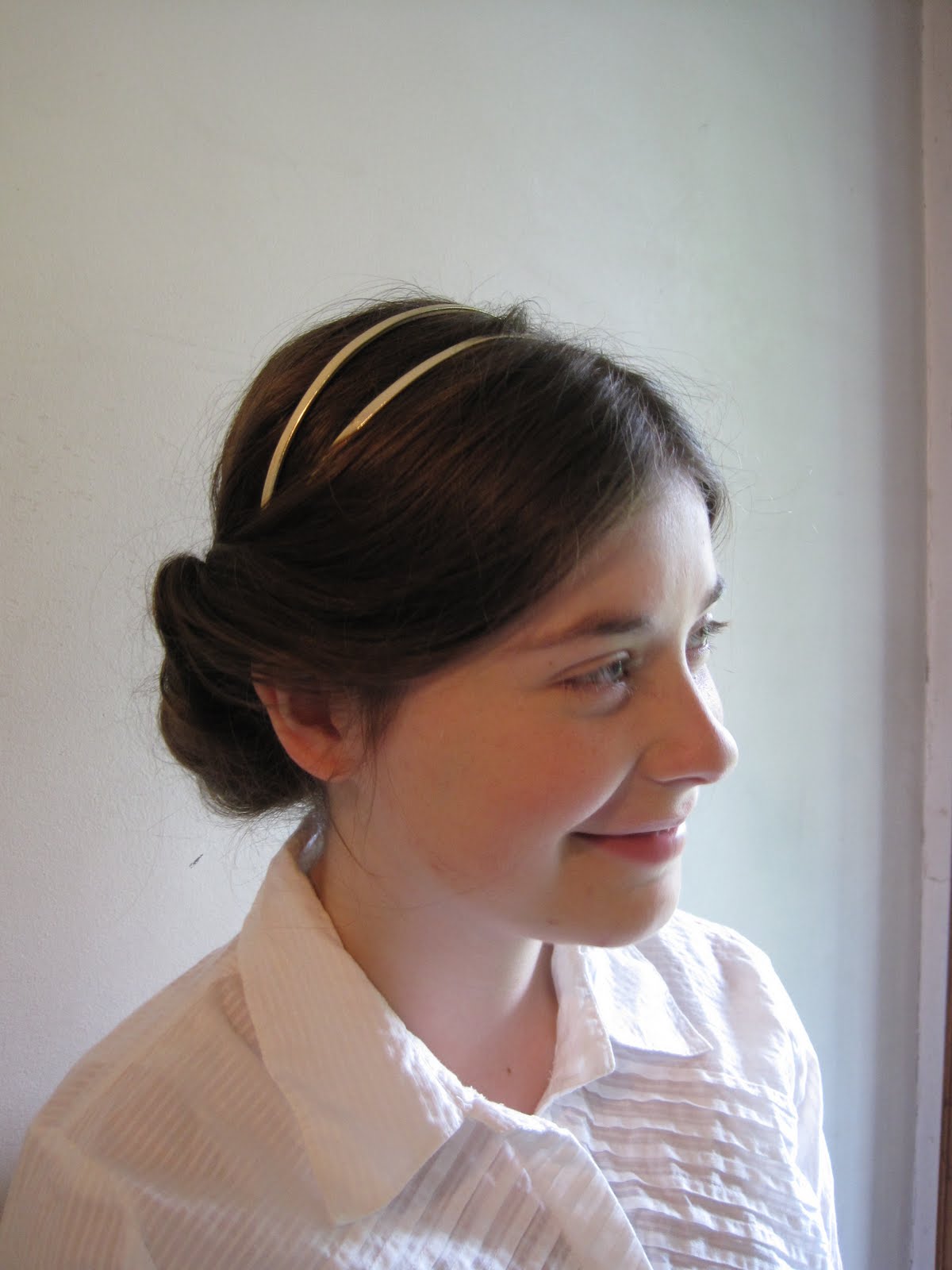 The ones I bought only have two bands, not three, but are otherwise quite lovely and similar. Of course, wearing this, it is a headband. I am now a bit concerned about where the medallions on the original would sit. Is it less of a headband? Do they sit on your ears? Looks uncomfortable, potentially.Either way, I've decided I like these headbands plain anyway. Doesn't this look like an awfully nice ragtime hairstyle? I am considering wearing two of them together, to make two or three bands (the middle one thicker for three, obviously), but I haven't quite gotten them to lay right. May be better to just do this instead. Thoughts?